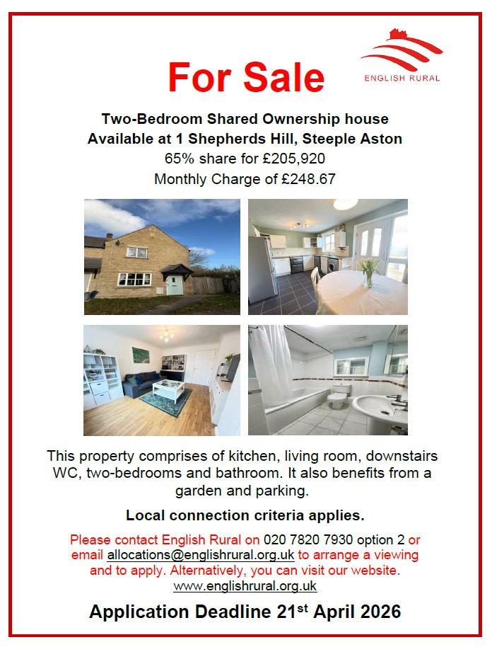 To be eligible for this property, applicants must have a local connection to the Parish of Steeple Aston. If they are unable to find suitable applicants from Steeple Aston, they will consider applicants with a local connection to the surrounding Parishes of Lower Heyford, Middle Aston, North Aston, Duns Tew and Somerton. However, priority will be given to anyone with a connection to Steeple Aston.