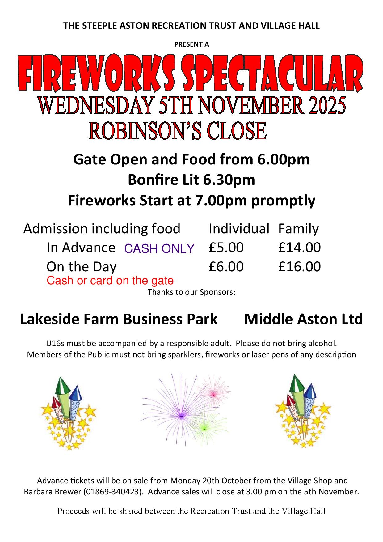 Ticket prices: bought in advance £14 family, £5 single. On the gate £16 family, £6 single. If you are purchasing tickets on the gate please come along with the correct money, cash or card on the gate. This will help speed up queues. Advance tickets are available from Barbara (01869 340423) and Steeple Aston Village Shop, CASH ONLY from Monday 20th October. Ticket sales from the Village Shop will close at