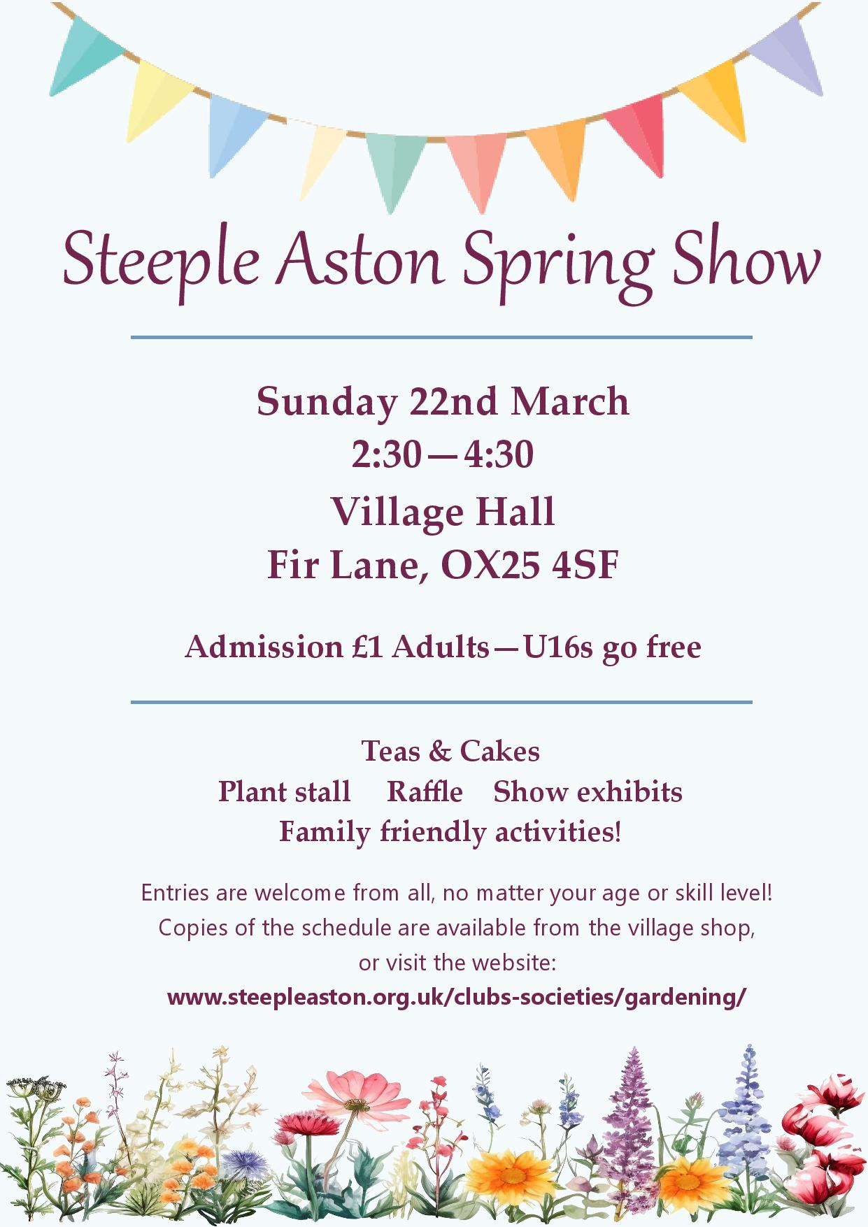 Steeple Aston and Middle Aston Horticultural Society will hold its Spring Show in the Village Hall from 2.30 – 4.30pm on Sunday, 22nd March. For details of all the classes and how to enter see the  Entry Form