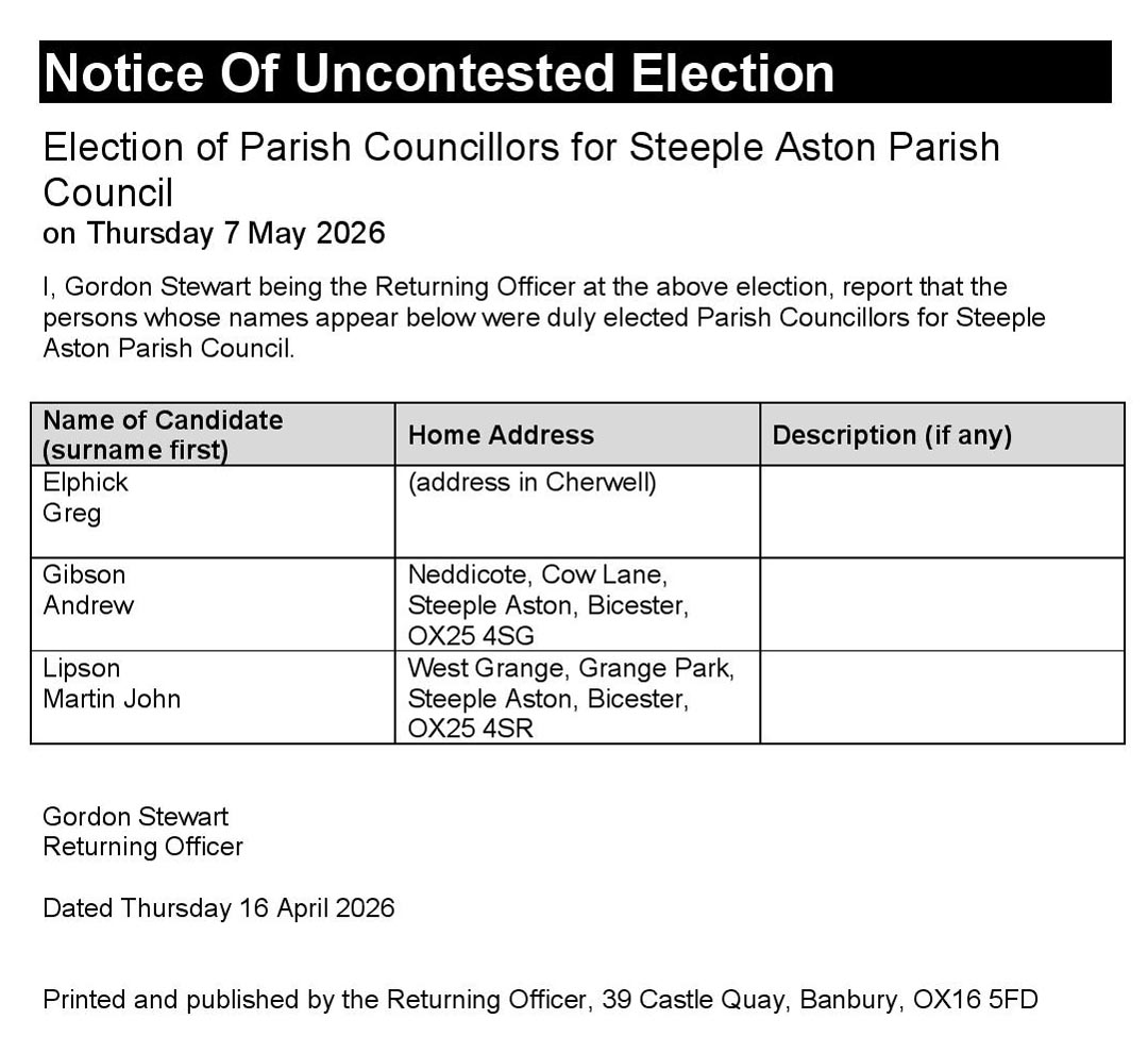 Nominations have closed for the local elections on Thursday, 7th May. As there were only three nominations for the seven vacancies on the parish council, there was an uncontested election.