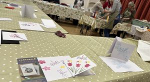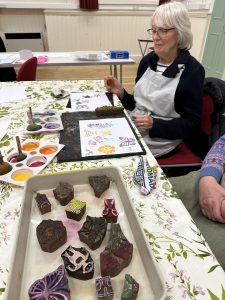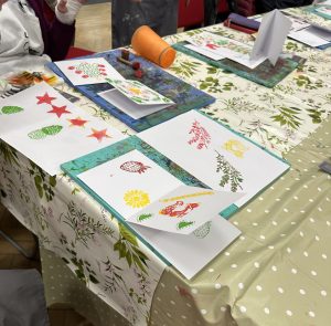 Block printing! Ready to make Xmas cards and various greeting cards – all manner of blocks ready for us. All supplied by the Larkswold team of crafters.