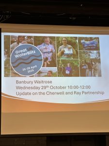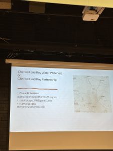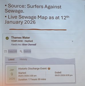 Sue Smith started by giving us some statistics, showing how fast the climate is changing. Sue talked about our rivers and surprised us with information about how much sewage is pumped into our rivers. We thought in only happened in exceptional circumstances. But because our Victorian sewage system is no longer fit for purpose it seems to happens all the time. Sue showed us a record of the previous day at the Thames Water treatment plant in Heyford. This map showed that on that day sewage had been pumped into the River Cherwell for 17.5 hours. She showed us a map of the waterways in this area and those coloured brown on the map had had sewage pumped into them. This was a map of the poo in the rivers of our local area!