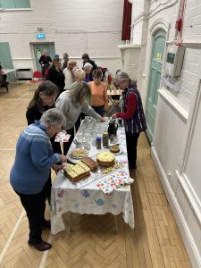 We started the evening by greeting our members as they arrived, and encouraging them to browse and of course to buy from the vast array of items on the long tables. We had arranged the seating for them of four chairs to each table and these were duly covered with tablecloths, on which nibbles, napkins and even the words to Jerusalem were carefully arrayed.